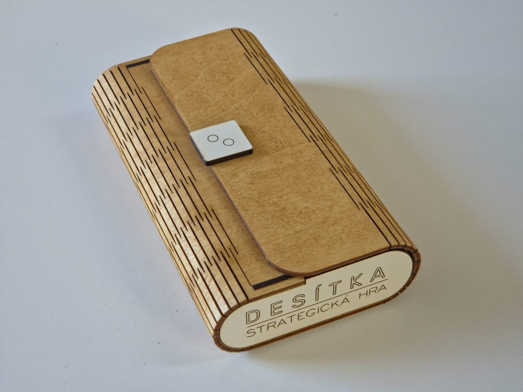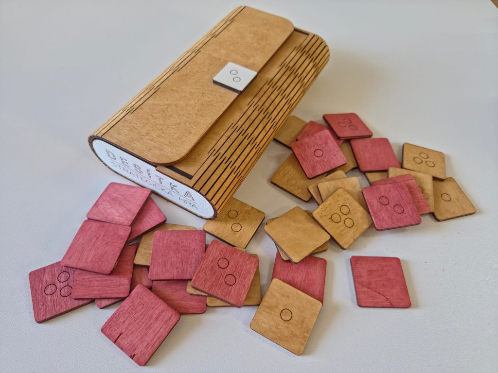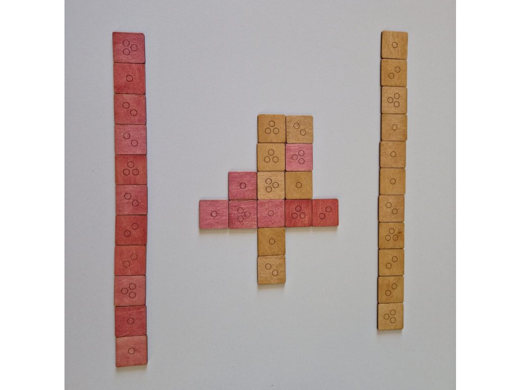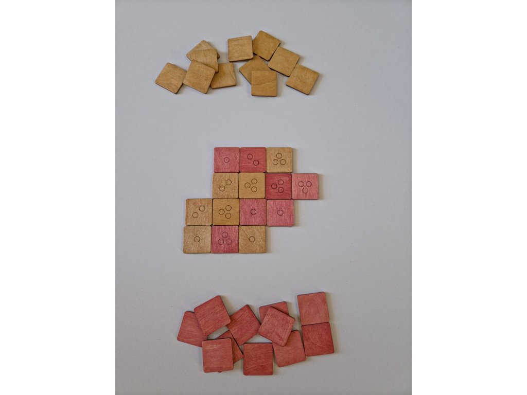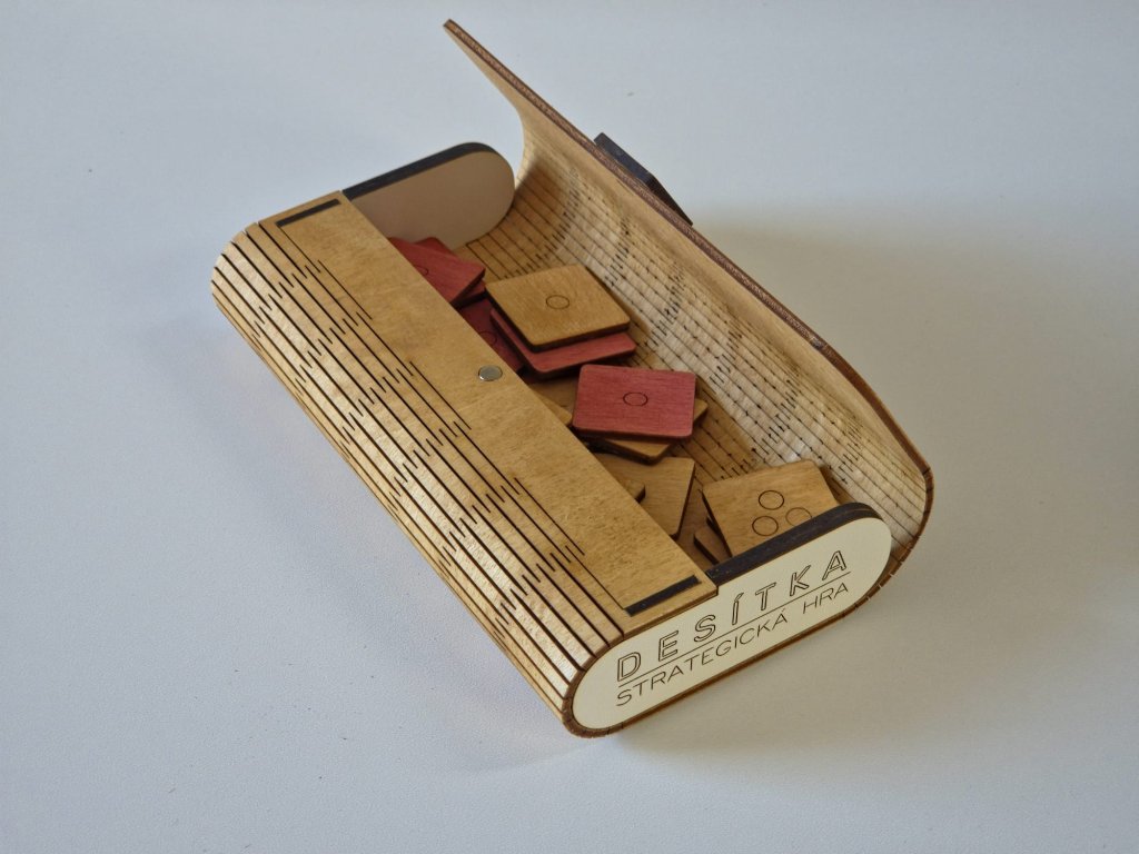 Kompaktní a praktická krabička obsahuje 18 přírodních dílků, 18 červených dílků a pravidla. Vyrobené z březové překližky ošetřené včelím voskem, rozměry 18 x 10 x 4 cm.