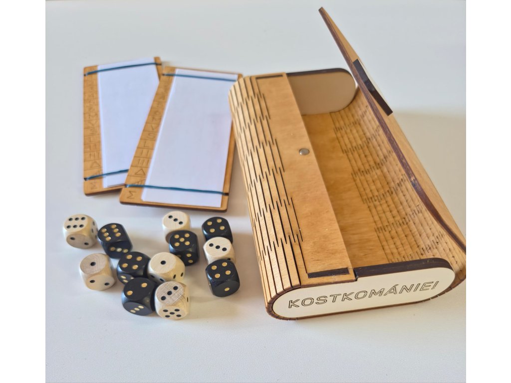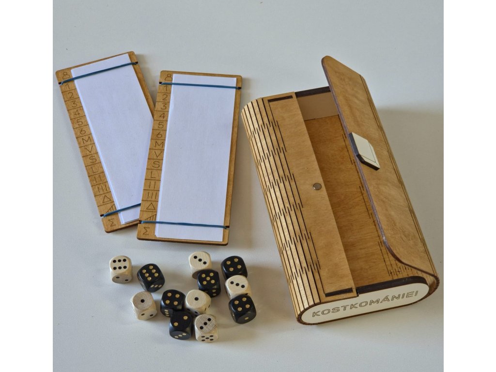 Kompaktní a praktická krabička obsahuje 6 světlých kostek, 6 tmavých kostek, 2 skórovací tabulky s náhradními lístky a pravidla. Vyrobené z březové překližky ošetřené včelím voskem, rozměry 18 x 10 x 4 cm.