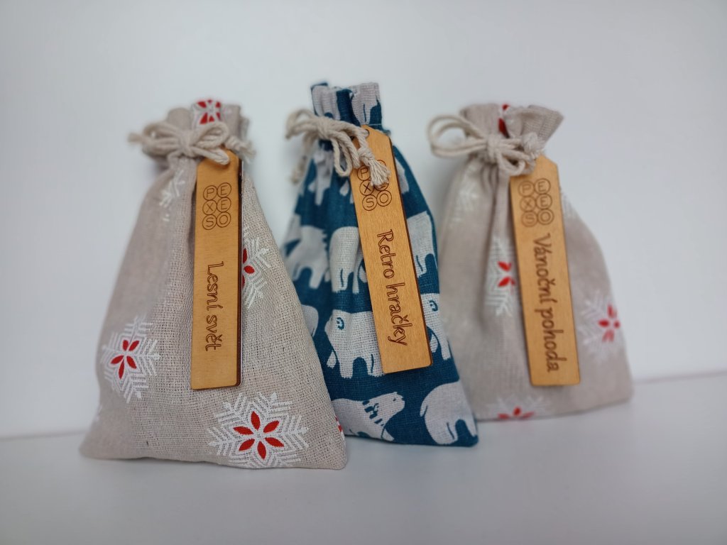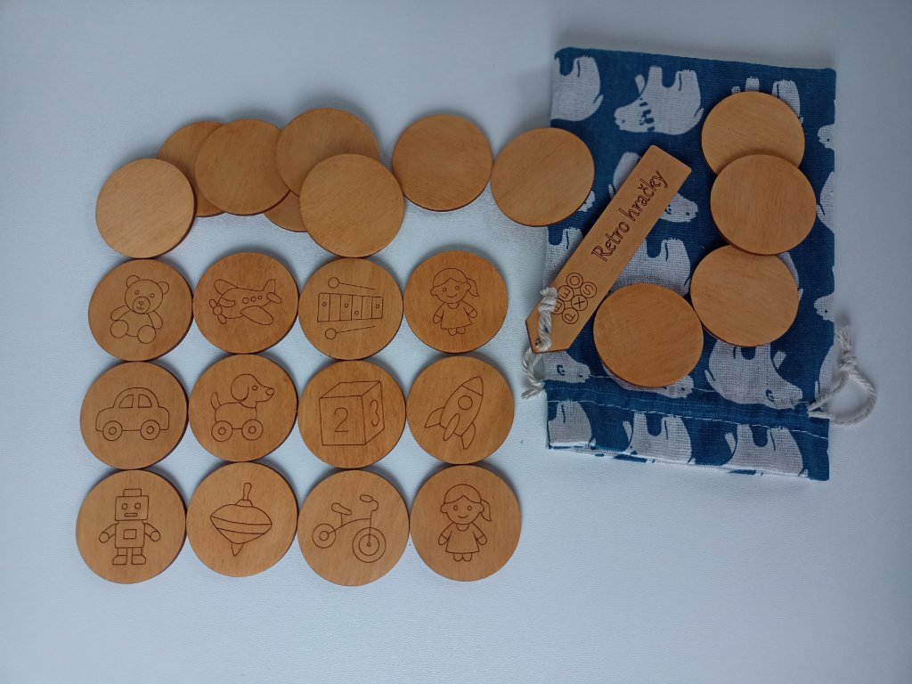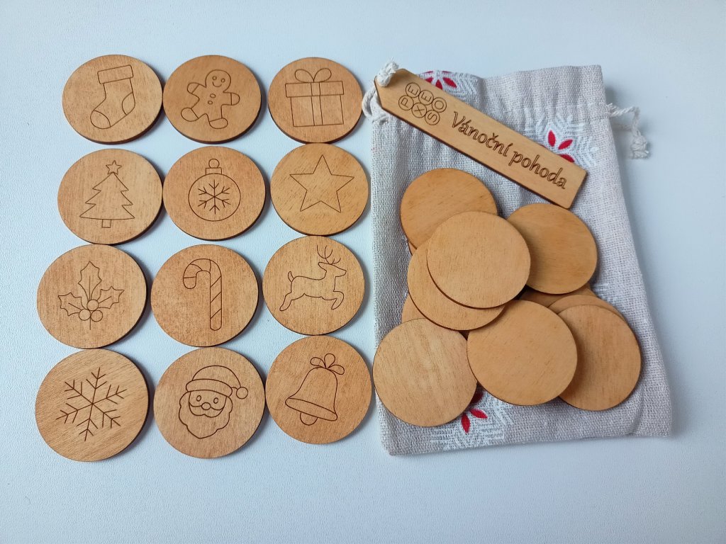 Praktický a elegantní sáček rozměru 13 x 18 cm obsahuje 24 kulatých dřevěných žetonů průměru 5 cm.