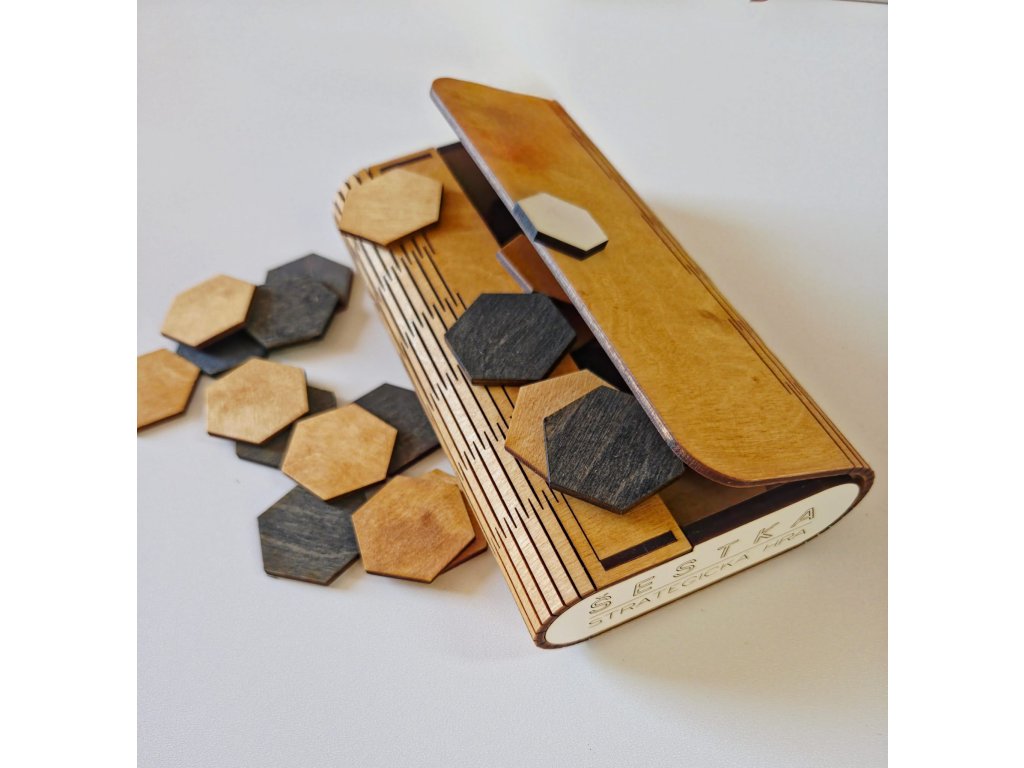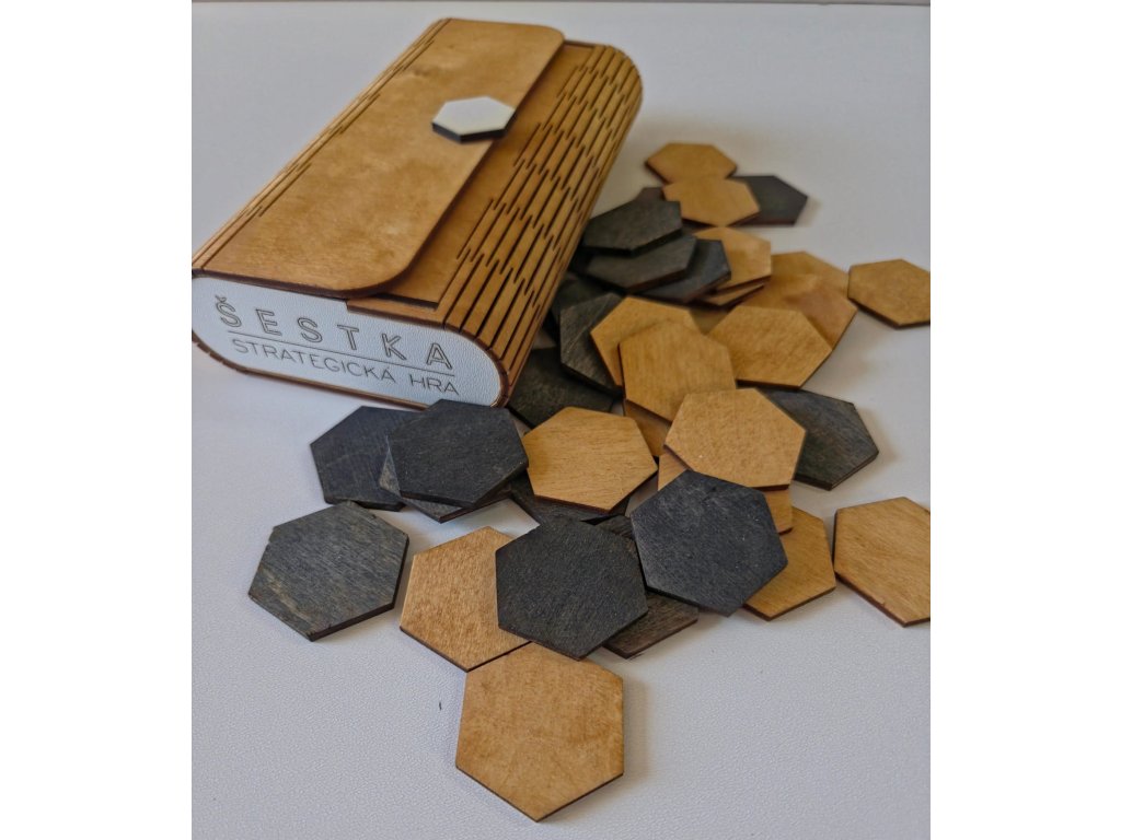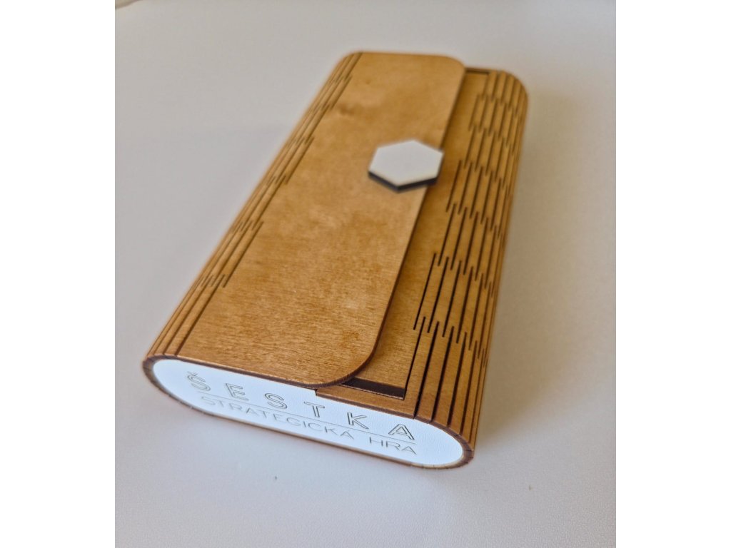 Objevte originální strategickou hru Šestka, která spojuje krásu dřeva s napětím při skládání vítězných tvarů! Tato stolní hra pro 2 hráče je vyrobena z kvalitní překližky a uložena v designové dřevěné krabičce na magnetek, takže je ideální nejen na doma, ale i na cesty. Kompaktní a praktická krabička obsahuje ručně vyrobené dřevěné dílky ve tvaru šestiúhelníků, které lákají k dotyku a vybízejí k taktice.