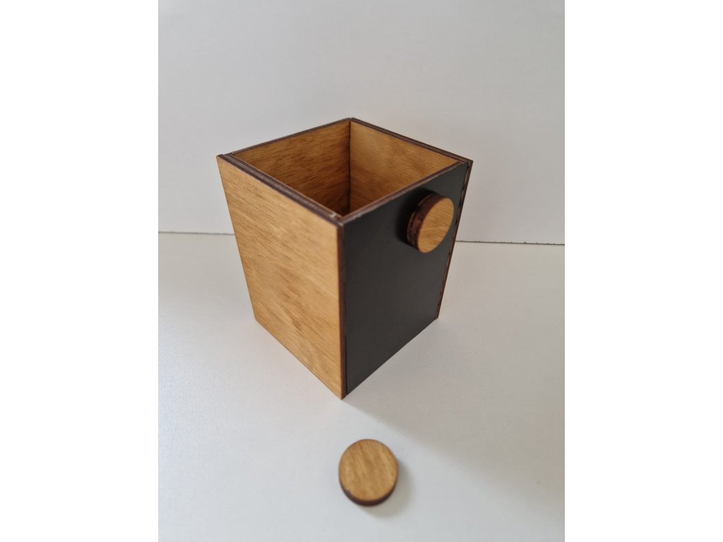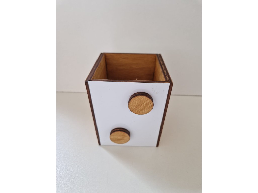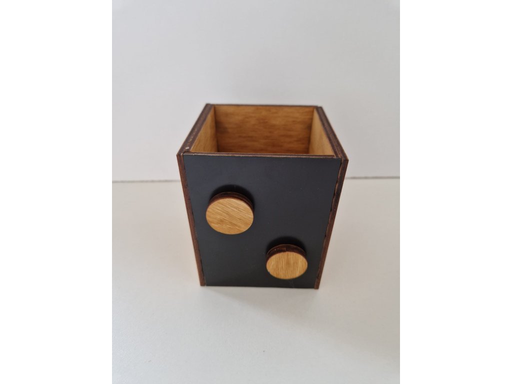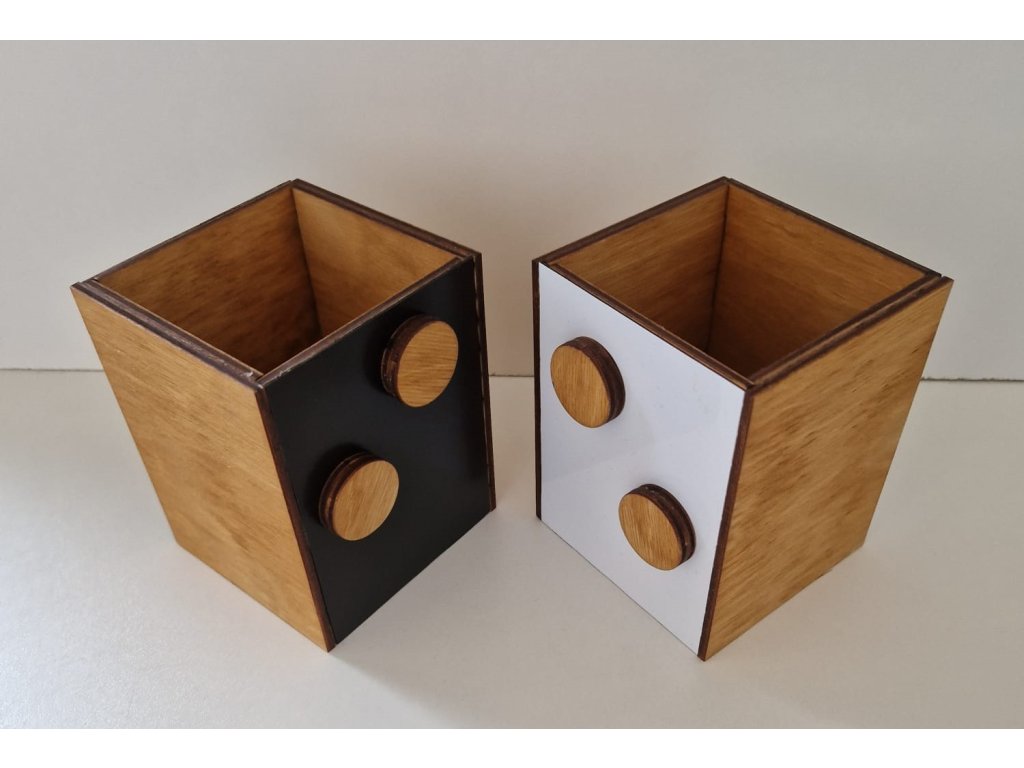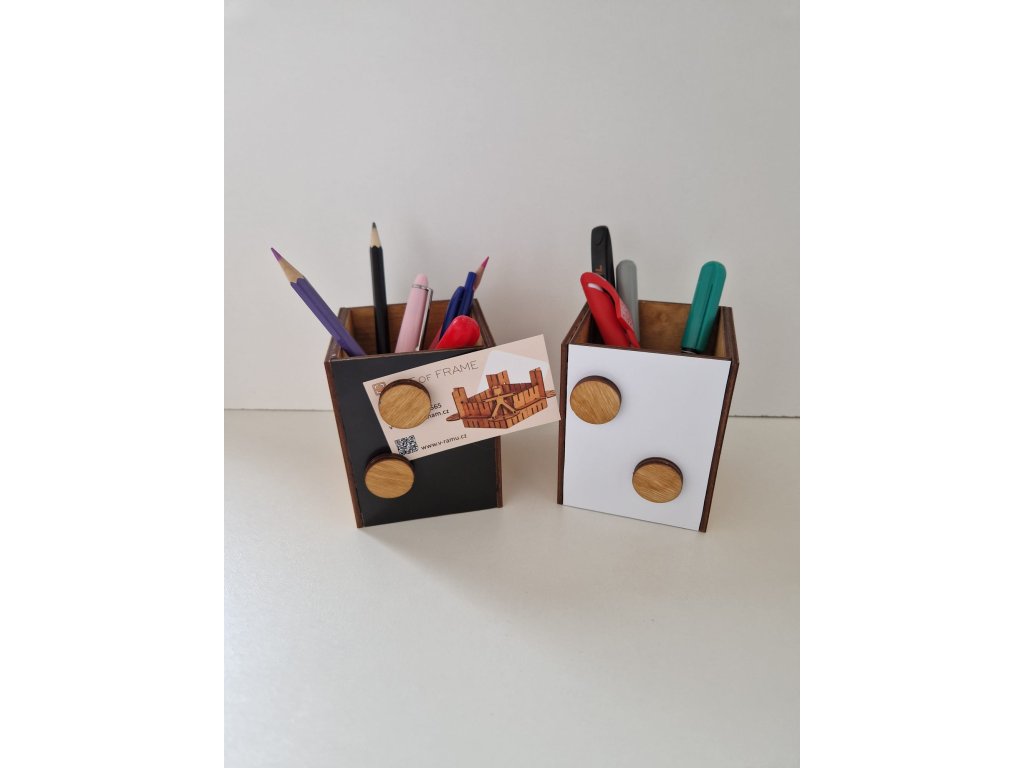Dřevo v kombinaci s černou nebo bílou barvou tvoří přírodní minimalistický dojem, který ozdobí moderní interiér. Stojánek můžete použít na psací potřeby, nářadí či další drobnosti. Dvě dřevěné magnetky slouží na připevnění lístečku s poznámkami, které máte vždy při ruce. Na výběr je tmavě hnědá nebo bílá folie, na kterou lze psát smazatelnými fixy. Na dřevěnou stěnu stojánku můžeme vygravírovat vaše jméno nebo logo.